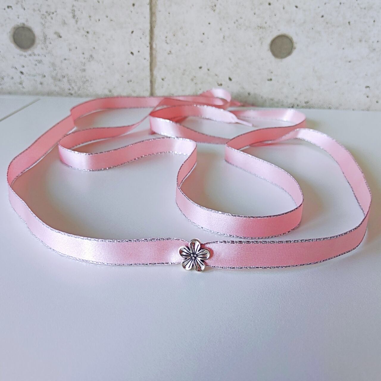 ●程よい光沢のきれいなベビーピンクに、シルバ―色のトリミングをほどこしたサテンリボンでつくったシューレースです♪
